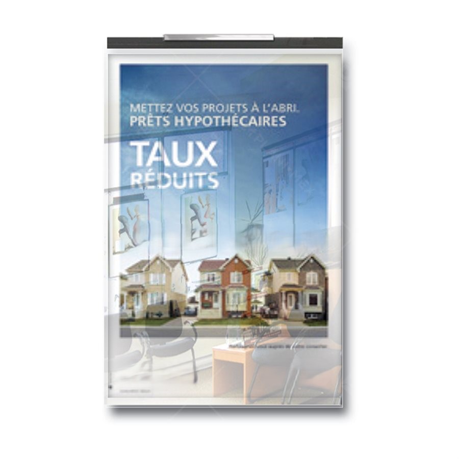 C1 wall mounted poster holder for 20 x 30″ poster supended from a slide bar. Poster(s) slipped between two acrylics.