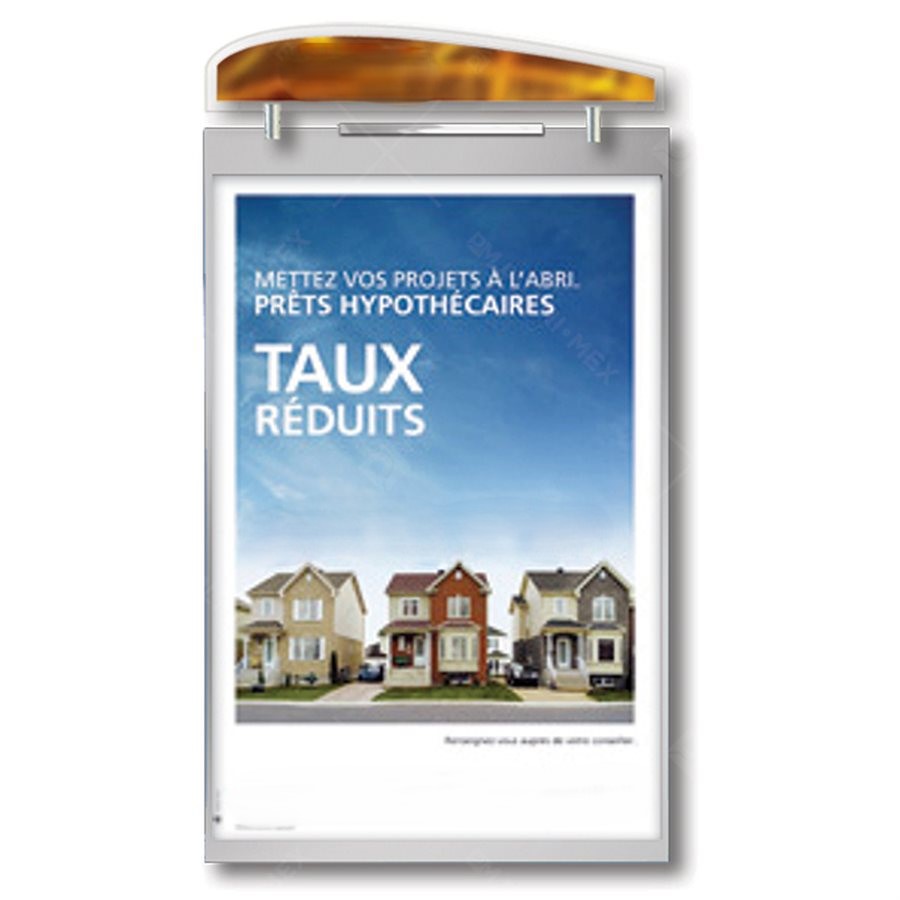 C10 wall mounted poster holder for 20 x 30″ poster with anti-buckling extrusion sides, suspended with an anodized aluminum U extrusion. Printed vinyl valance hold with 2 decorative fasteners.