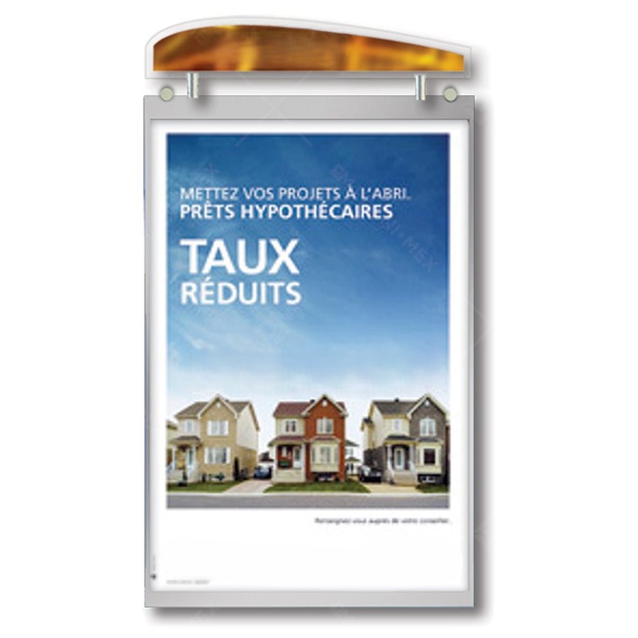 D10 wall mounted poster holder for 20 x 30″ poster with anti-buckling extrusion sides, suspended with two decorative fasteners. Printed vinyl valance hold with 2 decorative fasteners.