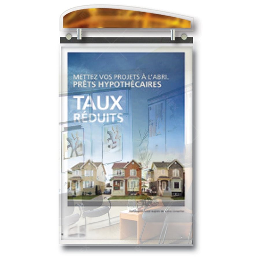 D3 wall mounted poster holder for 20 x 30″ poster suspended with 2 decorative fasteners. Poster(s) slipped between two acrylics. Printed vinyl valance hold with 2 decorative fasteners.