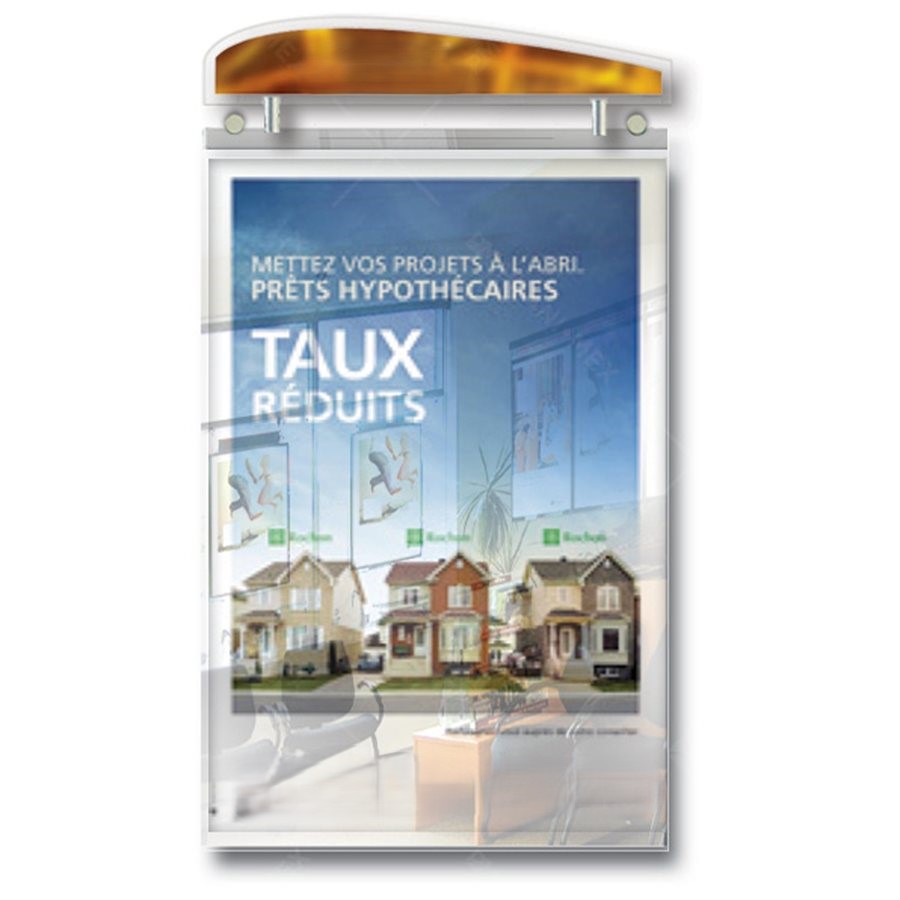 D4 wall mounted poster holder for 20 x 30″ poster suspended with 2 decorative fasteners. Poster(s) slipped between two acrylics. Printed vinyl valance hold with 2 decorative fasteners.