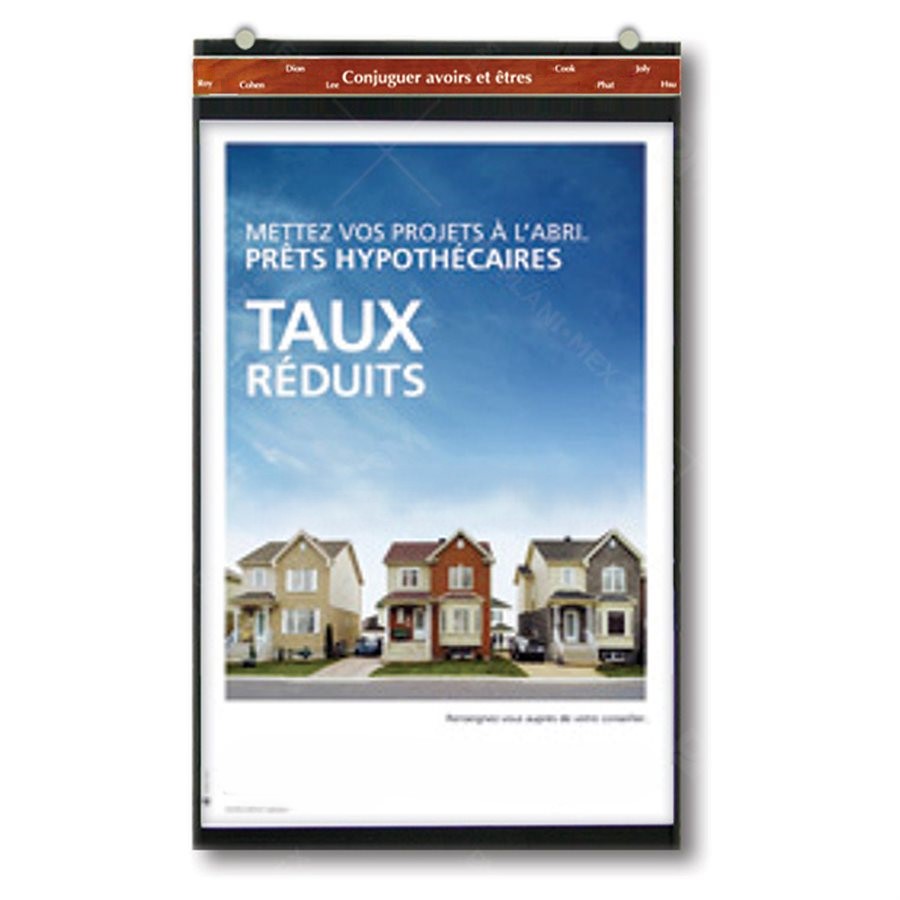 D7 wall mounted poster holder for 20 x 30″ poster with anti-buckling extrusion sides, suspended with two decorative fasteners. Extrusion at the top for inserting tab.