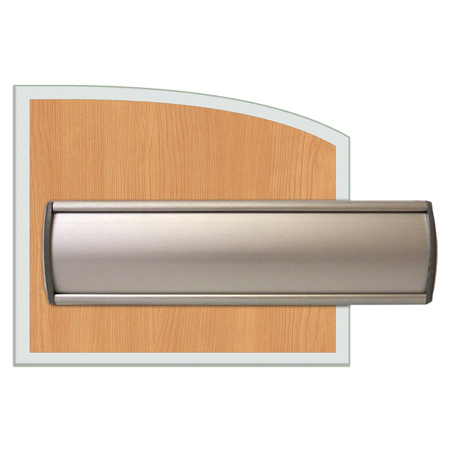 Wall name plate, curved extrusion 6 x1.75″ without reflection, message printed on acetate leaving the appearance of anodized aluminum.