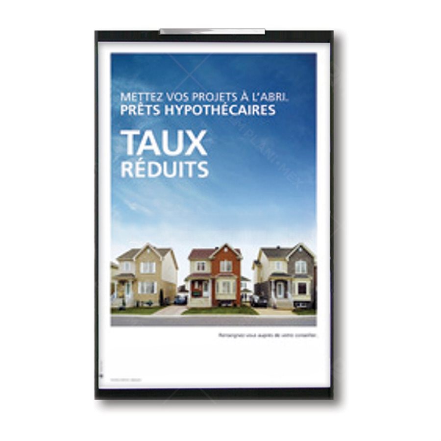 Porte-affiche mural C5 pour affiche 20 x 30″ avec extrusion anti-gondolement sur les côtés, suspendu avec une extrusion en U en aluminium anodisé.