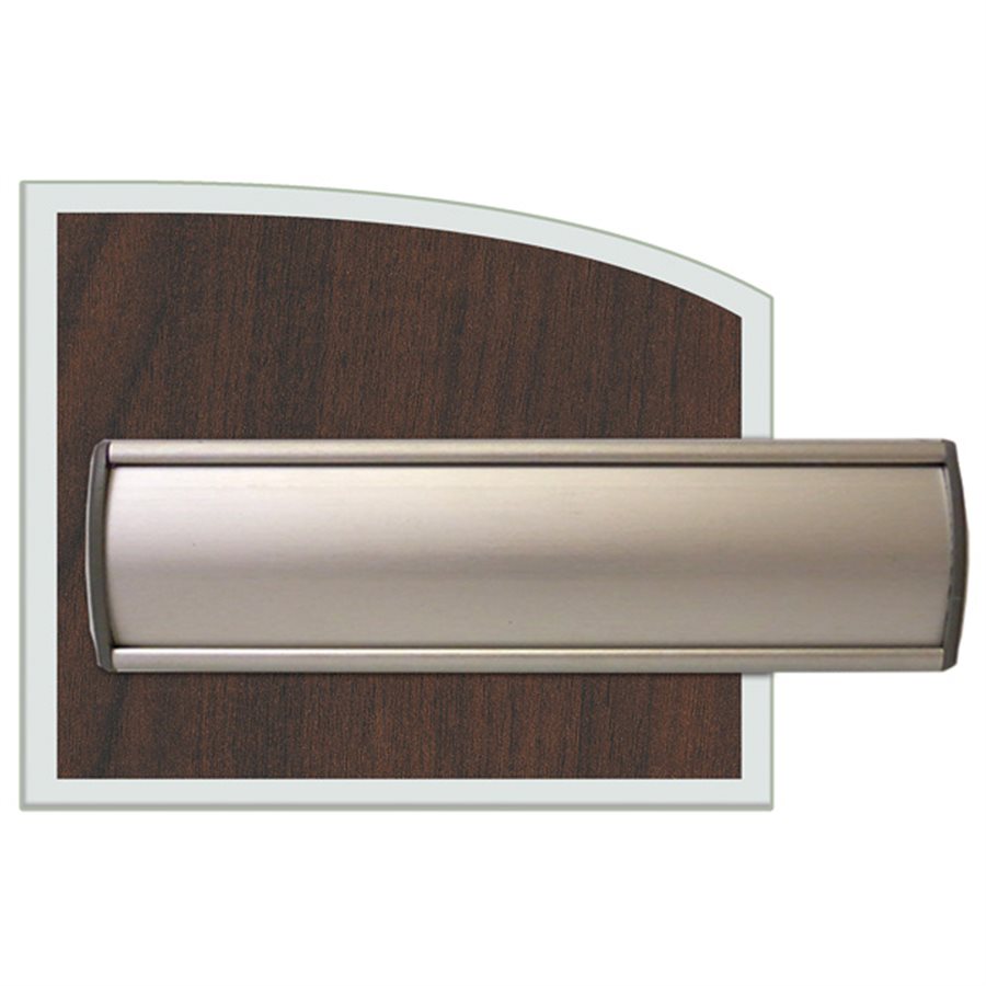 Porte-nom mural, extrusion courbée de 6 x 1,75″ sans reflet, message sur acétate laissant paraître le fond en aluminium.