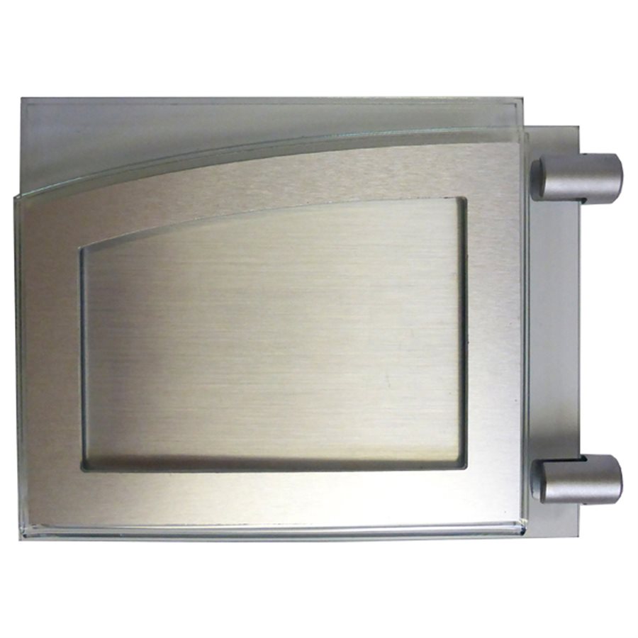 Porte-nom mural, plat, perpendiculaire au mur et double face, avec attaches décoratives, design assorti, partie centrale découpée pour conserver la clarté du message.